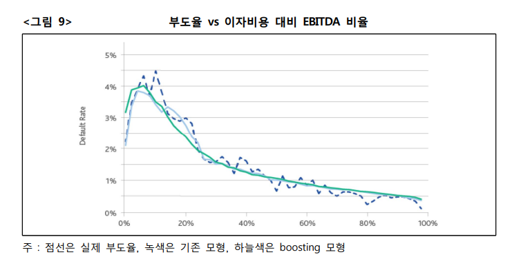 이러한 과정을 통해서 구축한 머신러닝 신용평가모형은 대개 모형 변별력이 우수하고 신용평가에 있어 비선형적 요소를 잘 반영하는 것으로 보고된다고 합니다. 한 사례로 Moody’s 의 연구결과를6) 예로 들자면, boosting 기반의 머신러닝 모형이 가장 우수한 변별력을 보여주며 <그림 9>와 같이 이자비용 대비 EBITDA 비율과 부도율 간의 비선형적 요소도 가장 잘 반영하고 있음을 확인할 수 있어요.