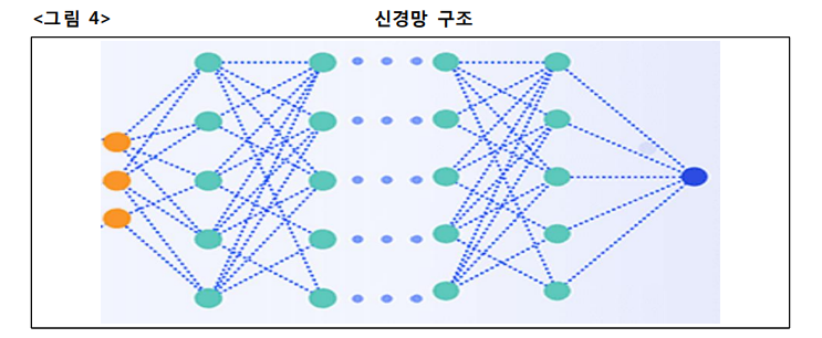 신경망 구조는 <그림 4>와 같은 형태를 띄며, 여기서 세 개의 오렌지색 원은 하 나의 입력층, 파란색 원은 출력층, 그리고 녹색 원들은 다섯 개가 하나의 층을 구성하며 여러 개의 중간층을 나타냅니다.