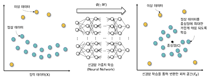 신경망을 학습시킬수록 정상 데이터들은 중심으로 몰리게 되고, 이에 따라 중심에서 먼 데이터를 이상 데이터로 판별하게 됩니다.