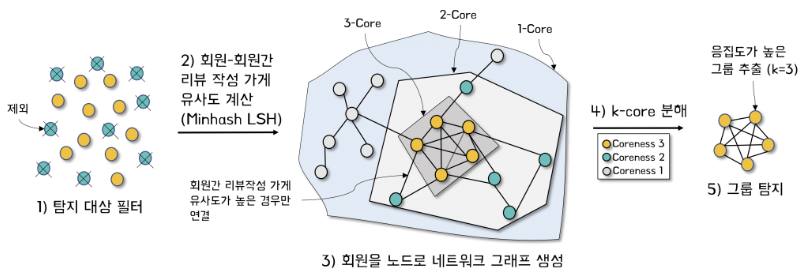 4. K-core 분해 : 해당 네트워크에서 커뮤니티 탐지 알고리즘 보다 더 강한 조건인 K-core 분해(decomposition)를 적용하여 그래프내 응집도가 높은 그룹만 추출합니다. 이를 통해 추출된 그룹을 리뷰 조작 그룹으로 판별하게 됩니다.