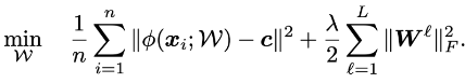 위 수식에서 ϕ(xi ;W)는 인공 신경망에 의해 변환된 정상 데이터, c는 정상 데이터의 중심을 나타내며, 정리하면, 모든 정상 데이터와 데이터 중심 사이의 거리를 최소화하는 알고리즘이라고 할 수 있겠습니다. ( λ/2로 시작하는 수식은 과적합 방지를 위한 식으로 자세한 설명은 건너 뛰도록 하겠습니다.)
