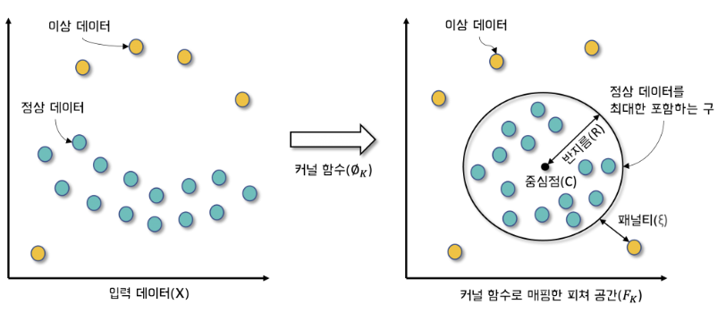 SVDD는 SVM을 통해 새롭게 매핑 한 공간에서 정상 데이터는 최대한 구 안에 포함하도록 하는 구의 중심과 반지름을 찾는 알고리즘입니다. 결과적으로 구의 경계 면을 기반으로 데이터가 안쪽에 위치하면 정상이고, 밖에 위치하면 비정상으로 판단하게 되는 것이죠.