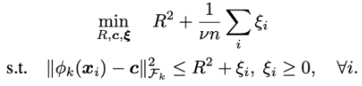 위 수식에서 R은 반지름, C는 중심, ξ는 페널티입니다. 수식에서 페널티 들어간 식은 일단 무시하고, "min R^2 "은 '반지름 제곱을 최소화한다'이죠. 또한 아래 s.t에서 " ||ϕ(xi) - c||^2_Fk ≤ R^2 " 이런 식이 보입니다. ||ϕ(xi) - c||^2 이 수식은 정상 데이터와 중심 사이의 거리를 나타냅니다. SVDD는 이렇게 정리할 수 있겠습니다.