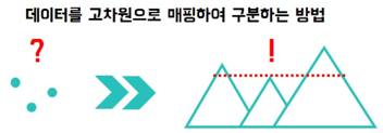 왼쪽 그림의 좌측 점은 1차원으로, 이 3개의 점을 구분할 수 없습니다. 하지만 이를 2차원 평면에 나타내면 우측 삼각형과 같이 삼각형의 높이로 구분이 가능하죠. 이처럼, 데이터의 차원을 높여서 데이터를 구분될 수 있도록 하는 작업이 바로 SVM입니다.