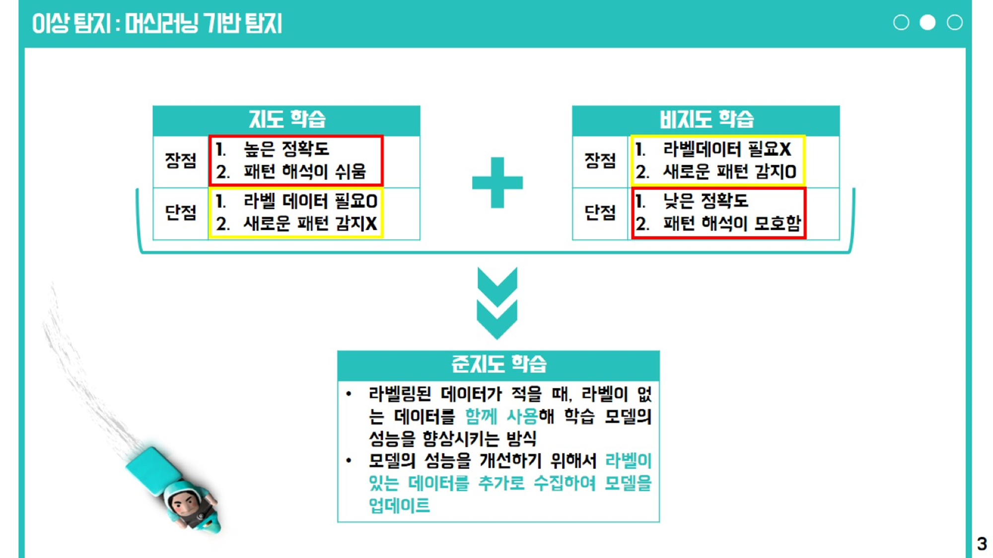 머신러닝 기반 탐지는 데이터 형태, 즉 라벨의 유무에 따라 지도 학습, 비지도 학습, 준지도 학습으로 나뉘게 됩니다.