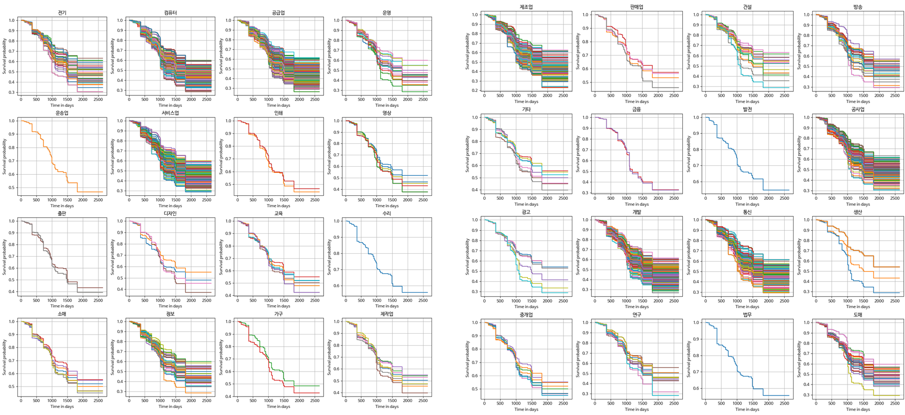 기업 업종 분류별로 나타낸 32개 종류 기업의 2017년 - 2022년 동안 RnD 과제 생존률을 나타낸 그래프입니다.