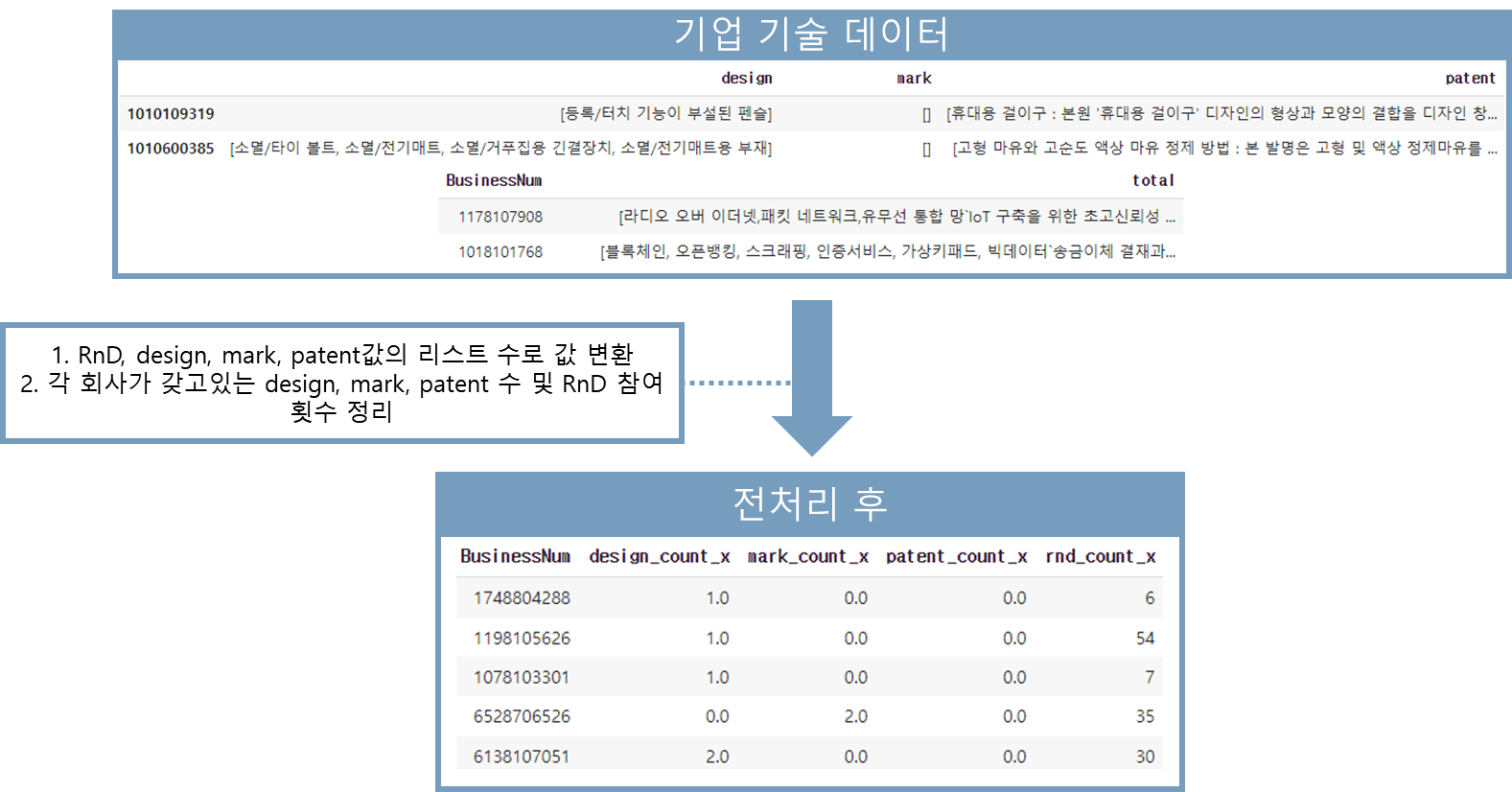 이러면 한 문자열이 하나의 RnD과제 혹은 지식재산권을 나타내게 되고, 이를 각 회사 별로 정리하여 아래의 전처리 후 데이터를 생성하였습니다.