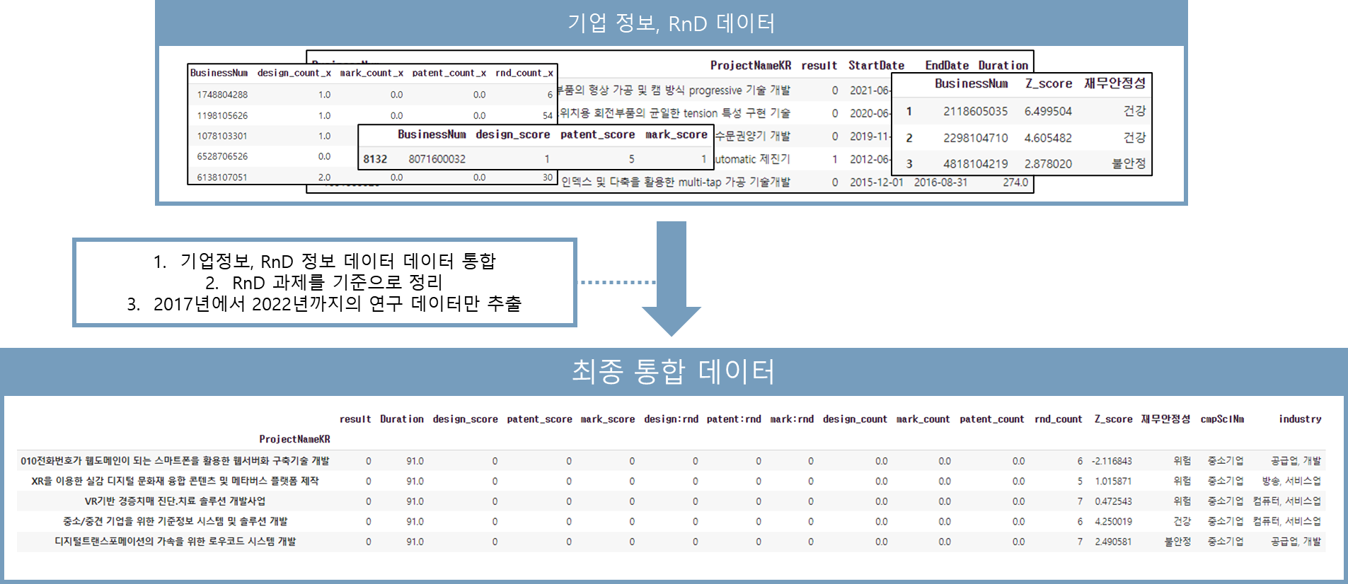 '국가 RnD 성과', '국가 RnD 연구보고서'라는 raw 데이터에 존재하는 RnD 과제의 경우 RnD의 성공사례로 가정하였습니다.(즉, RnD 리스트의 RnD과제들 중 위 데이터에 있는 과제들은 연구에 성공한 과제들인 것입니다.)