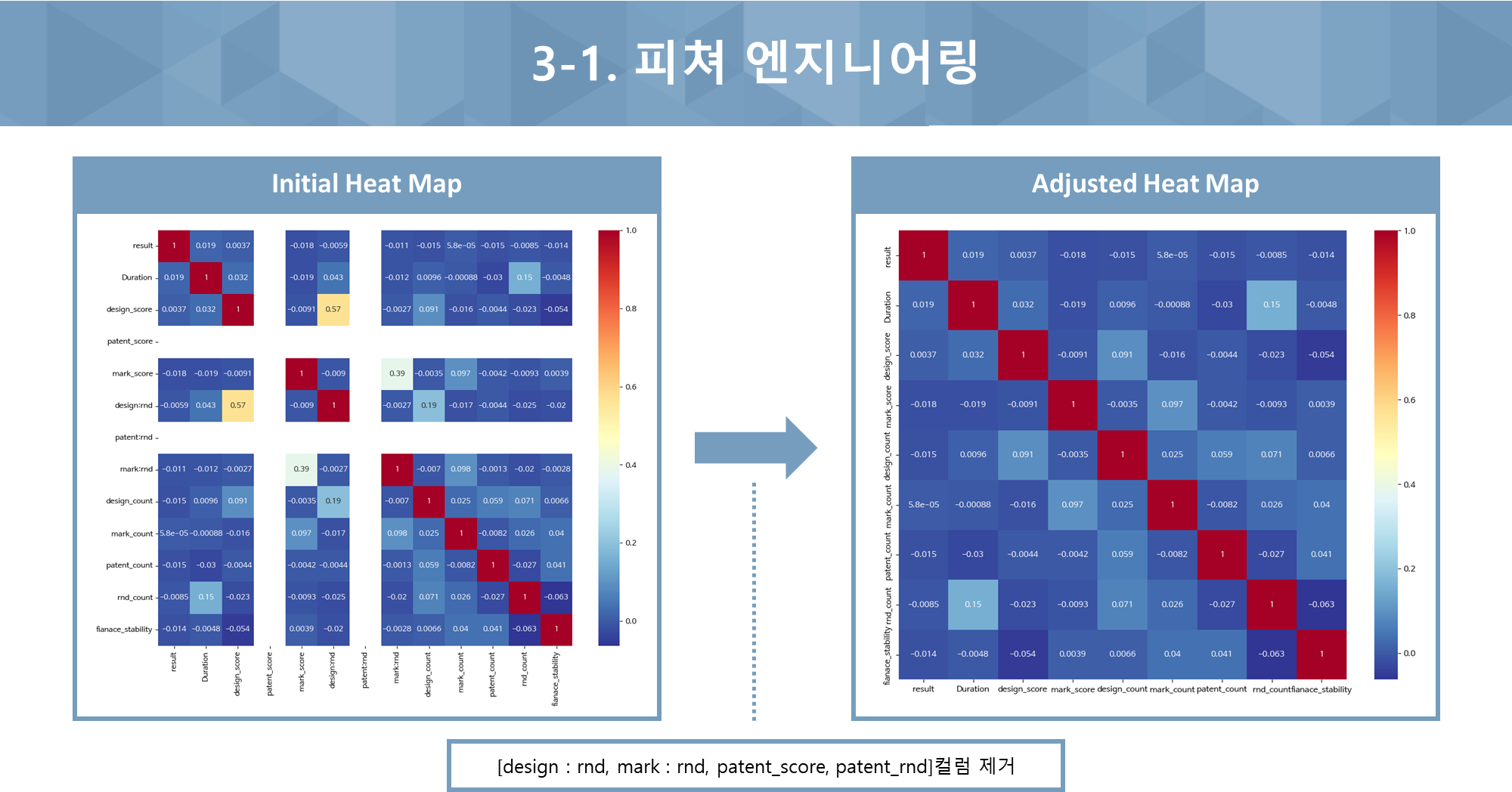 통합된 데이터의 각 컬럼들의 상관관계를 살펴본 결과, 왼쪽 Initial Heat Map과 같이 나타나게 됩니다.