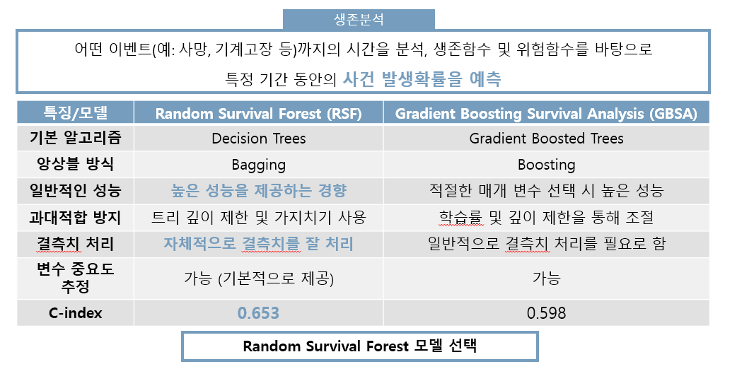 알려져 있는 모델의 성능 및 실제 성능 수치로써 C-index를 비교해본 결과 Random Survival Forest 모델을 선택하게 되었습니다.