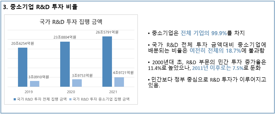 요악하면, 우리나라의 RnD는 시장성에 맞지 않는 경우가 많아 실속이 없는 상황입니다. 이에 대한 해결책이 중소기업 RnD 의 성장이지만, 대기업 중심의 투자 구조로 인해 중소기업 RnD 성장이 거의 불가합니다.