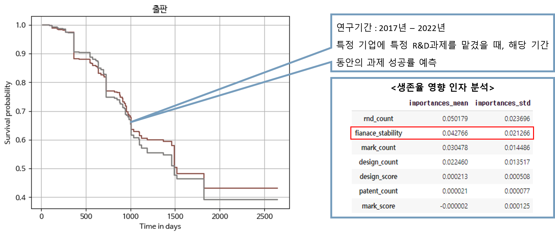 y축은 생존 확률 즉, RnD 과제가 성공할 확률이며 x축은 프로젝트를 진행하는 일 수입니다. 그래프의 추이를 통해 시기별로 생존률이 급감하는 시기를 예측해볼 수 있습니다.