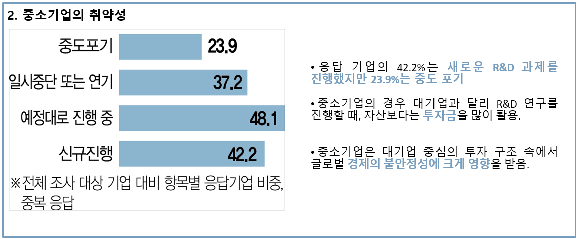 2. 중소기업의 경우 RnD를 진행함에 있어, 자산보다는 투자금을 활용하기 때문에 경제 상황의 영향을 크게 받는다.