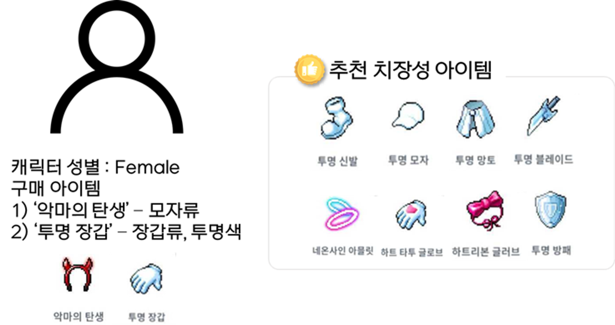 위 모델이 예측한 결과로 어떻게 추천 되었는지 샘플로 확인해 보았습니다. 캐릭터 성별이 여성인 A 유저는 2개의 아이템을 구매한 경험이 있는 유저입니다. 이 유저가 구매할 가능성이 높은 아이템 순으로 정렬하면 오른쪽과 같습니다.