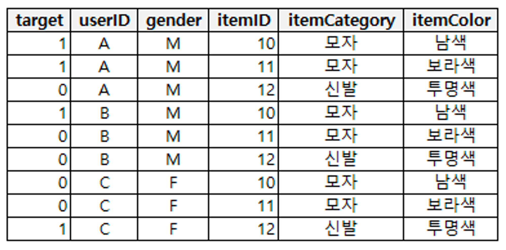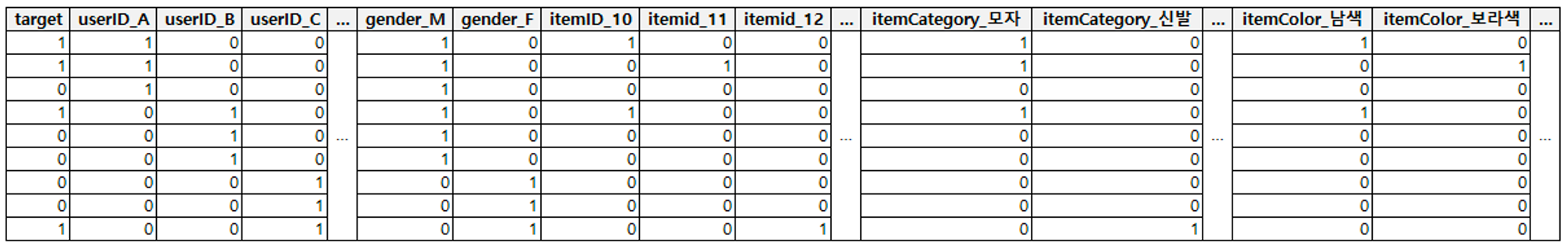 유저 ID와 아이템ID 외에 구매 유저의 캐릭터 성별과 치장성 아이템의 부위 정보 및 색깔 정보 메이터를 추가합니다. 구매한 데이터뿐 아니라 구매하지 않은 데이터도 포함해야 합니다. 구매하지 않은 아이템에 대해 구매할 확률을 추정해야 하기 때문입니다.