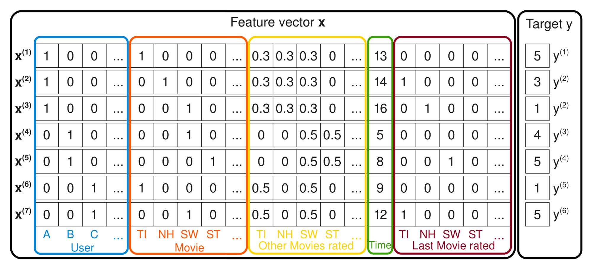 위의 그림에서 파란색 영역은 유저를 의미하는 변수이고, 주황색 영역은 아이템(영화)를 나타내는 변수입니다. 노란색 영역은 유저가 다른 영화들에 평점을 매긴 변수이며, 녹색은 월 단위 시간을 나타냅니다. 마지막 붉은색 영역은 해당 영화를 평가하기 바로 직전에 평가한 영화를 의미합니다. 그리고 맨 오른쪽 열이 목푯값 y 입니다.
