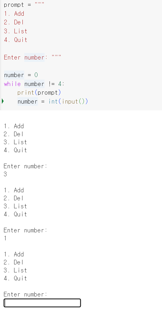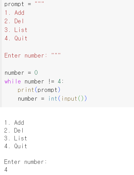 문자열을 만든 뒤 while문을 보면 while number ! = 4: 는 숫자 4를 넣지 않을 때까지 반복하라는 뜻이다.