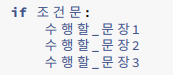 if조건문을 작성할 때, if문에 속하는 모든 문장에서 들여쓰기를 해야한다. 파이썬은 자동적으로 들여쓰기가 되지만 반대로 자동으로 들여쓰기하는 것에 주의해야 한다!!!