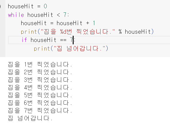 만약 houseHit의 값이 계속 1만큼 증가하다가 7이 되면 "집 넘어갑니다."라는 문장을 출력하게 된다.