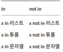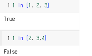 X가 리스트에 존재하면 true, 존재하지 않으면 false가 리턴된다. not in은 반대이다.