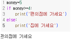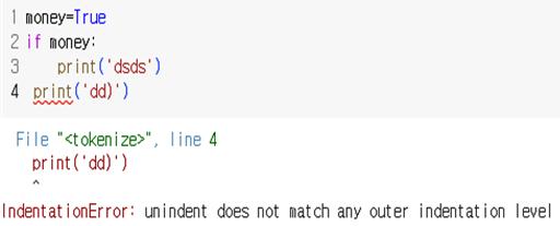 ※ if,for,while 문을 작성할 때 뒤에 오는 코드는 [Tab] 또는 [Spacebarx4]로 들여쓰기를 한 후, 작성해줘야한다. 들여쓰기를 하지 않으면 오류가 발생한다.