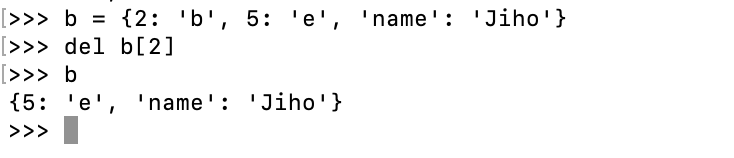del 딕셔너리_변수_이름[Key]를 입력하면 해당 Key와 그에 대응하는 Value 한 쌍이 삭제된다.