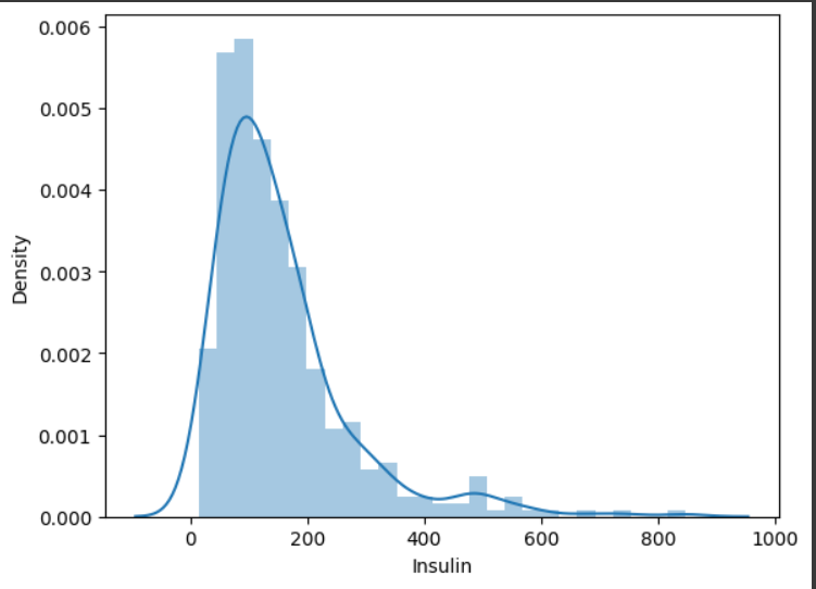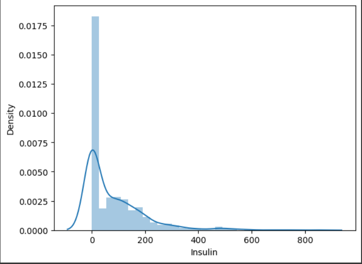 이때 결측치를 처리 안한 인슐린 값은 0에 붙어서 그림이 그려지므로 결측치 처리한 값을 보겠다.