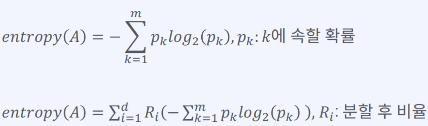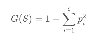 S: 이미 발생한 사건들 c: 사건의 개수 p: 전체 사건 중에서 특정 사건의 수 --> 지니 계수가 높을 수록 데이터가 분산되어 있음을 의미