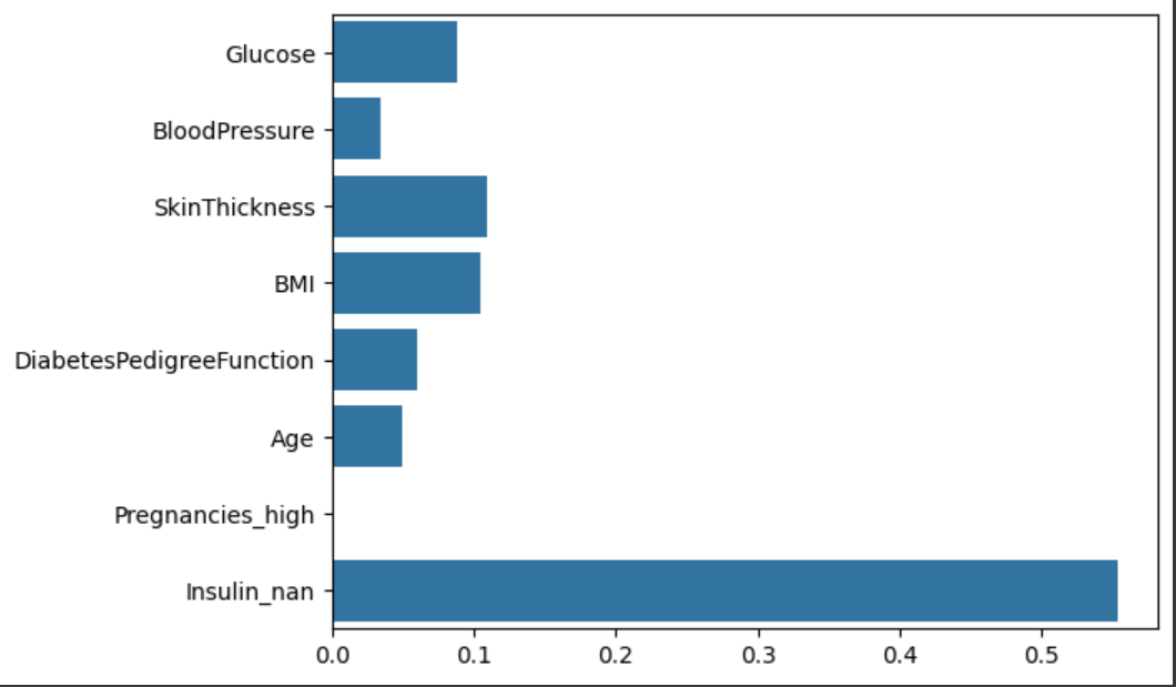 1주차의 그래프랑 비교했을때, Pregnancy의 중요도 보다 Pregnancies_high의 중요도(가장 아래)가 훨씬 낮게 나온것을 볼 수 있습니다. 이번에 학습된 모델에서 Pregnancies_high는 별로 중요한 역할을 하지 않은 걸로 볼 수 있습니다.