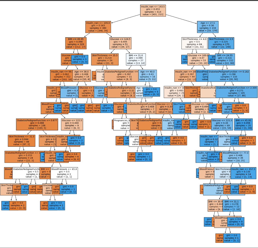 여기서 Age, Insulin, 그리고 SkinThickness 같은 항목들은 수치의 범위가 꽤 넓은 편입니다. 이렇게 범위가 넓은 수치형 변수들은 DecisionTreeModel에서 조건이 엄청 세분화 되어 나눠지게 됩니다. (leaf 샘플의 개수가 1개, 2개가 생기는 경우가 발생)